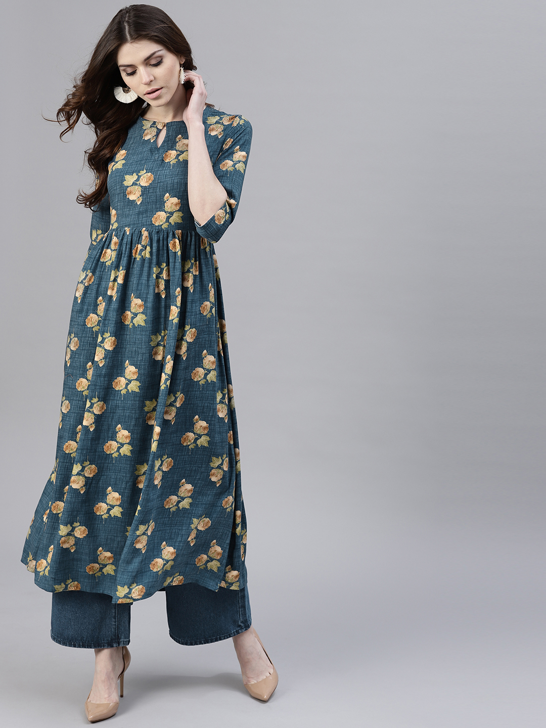 7th outfit, Denim colored A-line Kurta in cold shoulder pattern. What I most love in this is prints by the side of sleeves. Buy