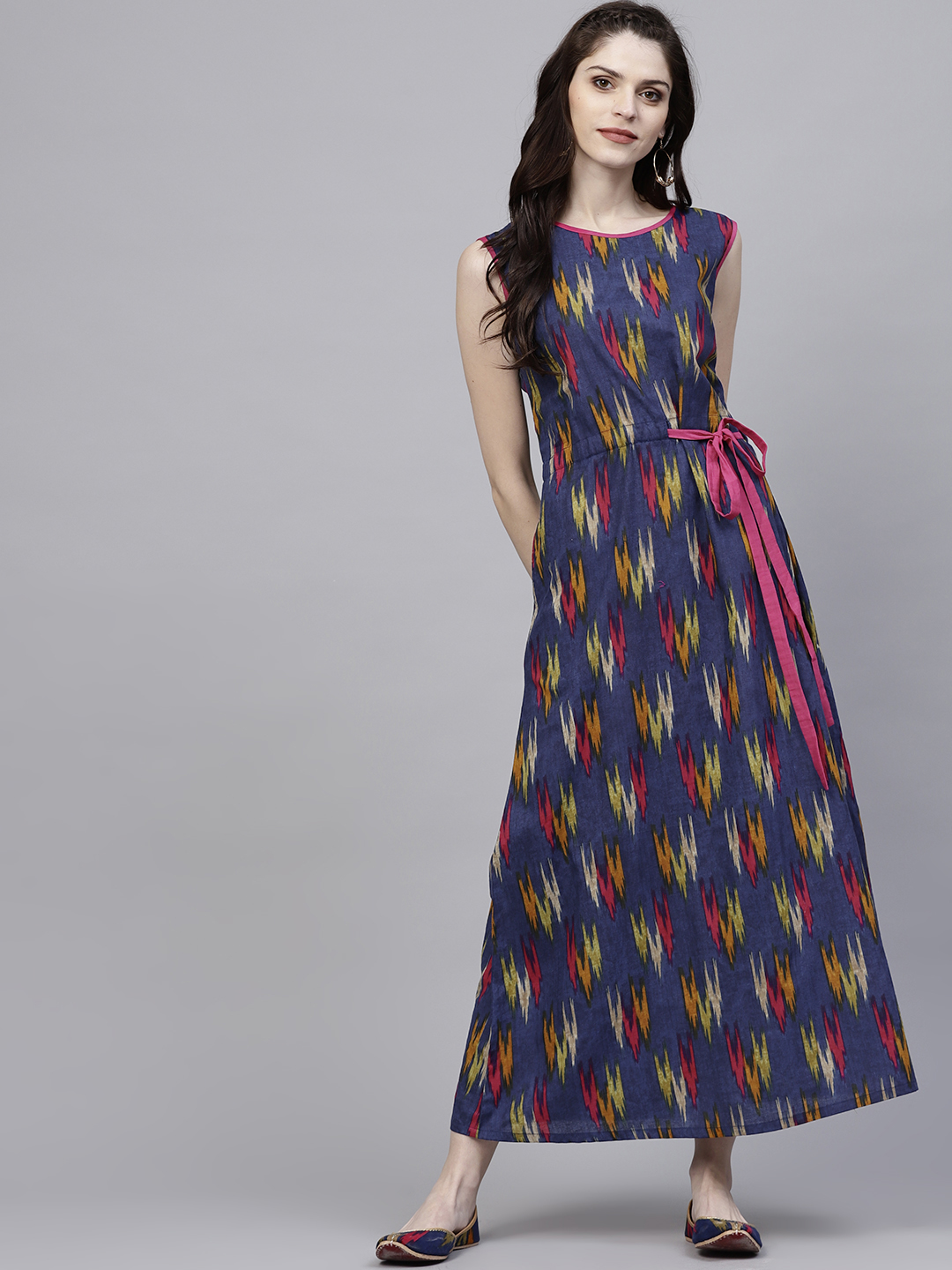 2nd outfit, simple boat neck ikat print maxi dress with belt at waist. Buy