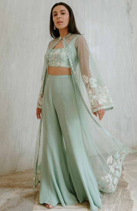 Another unique look you can create is with straight silk pants and a crop top with an ethnic full-length jacket. Such looks are perfect for Festivities. You can also check out other festival look here.